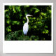 A digital painting of a Great Blue Heron, painted white, standing on top of a tree in a woodland.