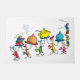This fantastic illustration captures the pure joy of the Whos of Whoville preparing their holiday banquet! Five Whos, dressed in festive, colorful aprons and hats, march in a cheerful procession, gleefully balancing massive, colorful loads, including a huge yellow tureen, oversized serving domes, and dangerously tall stacks of small, brightly colored bowls. This whimsical scene perfectly embodies the chaotic but heartwarming spirit of the Whos' Christmas celebration!
