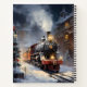 Train enthusiasts will love this winter train notebook. It features a locomotive with steam rising above it pushing past a train station covered in snow and decorated for the holidays. You can choose from multiple styles of interior pages and pick between a hard cover and soft cover.