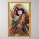 Features a decadent painting of a woman most likely from the 1930's in a fur stole, a hat bearing large feathers with a hat pin and emerald earrings. In rich colours of amber, gold and green. A beautiful vintage painting.