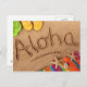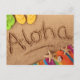 The word Aloha written on a sandy beach, with 2 Postcard