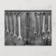A black and white photograph of well-ordered tools hanging from a wooden board.