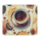 The art was created digitally using special computer software, it is a unique look to this glass cutting board. In the center there is a cup with coffee in it then there are coffee beans around it and finally there ate wild coffee stains.