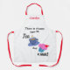 There is always time for tea and cake. This white apron with red straps is decorated with a steaming cup of tea in a blue cup and saucer, and a delicious pink iced cup cake. You can personalise it with your name.