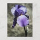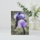 A photograph of a new purple Iris flower blossom. The background is a boulder in the garden.