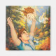 A joyful scene unfolds as a smiling man lifts a delighted baby against a backdrop of a vibrant autumn forest with a cascading stream. Sunlight filters through the trees, highlighting the warmth and happiness of the moment. Digital Art