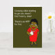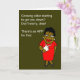 This design was created using digital art. The front of the card features a middle-aged woman wearing a red dress. Her words set up the explosive message on the inside.