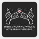 A set of hands with forearms sign the word "different" in American Sign Language. A red heart has formed where the two forefingers cross with white rays emanating. The text beneath says in uppercase, "There's nothing wrong with being different."