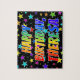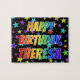 This vibrant, lively, birthday-themed jigsaw puzzle design features the message "HAPPY BIRTHDAY, THERESA" with the characters having a colorful rainbow spectrum inspired gradient pattern, in addition to an exciting star field background pattern. A colorful puzzle like this might be used to send a birthday greeting message to somebody named Theresa. [~Z0000468]