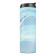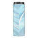 This thermal tumbler is shown in a blue and white colours abstract flowing lines pattern print design.