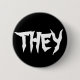 Black background round button with the word "THEY" in all caps in a font that's a similar style to what metal bands use on their album covers.
