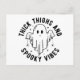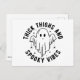 This fun and spooky Halloween design features the phrase "Thick Thighs and Spooky Vibes" arranged in a circular layout around a cute, classic ghost illustration. The ghost, with its simple yet expressive eyes, is the central focus of the design, giving it a playful and whimsical vibe. Hanging from the ghost's hands are two small spiders, adding a touch of creepiness to the otherwise light-hearted design. The text is bold and clean, creating a strong visual impact while maintaining a playful tone. The black and white colour scheme gives the design a timeless and versatile look, making it perfect for Halloween.