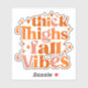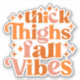 This vibrant and playful fall design features the fun and confident phrase "Thick Thighs Fall Vibes" in a bold, retro-inspired font. The text is arranged in a dynamic, stacked layout, with each word filled in warm autumn hues, including shades of orange, peach, and soft pink. The surrounding star-like sparkles add a touch of whimsy and shine, enhancing the festive and cosy feel of the design. The typography is both bold and curvaceous, giving it a lively, vintage appeal that perfectly captures the essence of fall.