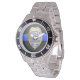 Has heft and feel of expensive stainless steel quartz watches. Good band with safety catch. I removed links, which is easy because engraved arrows show direction to push the linking pins. As always by this seller, the image (a railroad logo) is a perfect reproduction of my emailed image, and is precisely spaced and aligned.