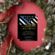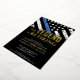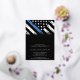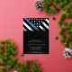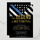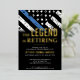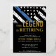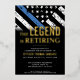 This design features a police force flag with black and white stripes, and a thin blue line stripe as well. "The Legend is Retiring" text sits above all of the party details for the retiring law enforcement officer, sheriff, captain, or chiefs retirement party details.