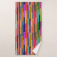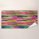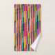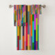 This towel set has a geometric design of colourful stripes running vertically.