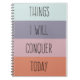 Organise your thoughts! This fun and stylish notebook features a background of colourful stripes. The colour palette consists of blue, purple, and different shades of pink. The notebook reads, “THINGS I WILL CONQUER TODAY” in black ink. This phrase can be a daily motivational reminder! The dimensions of this notebook are 6.5 x 8.75 inches, and it contains 80 black and white lined pages. These are terrific gifts for teachers! As a former teacher, I know there are a countless amount of tasks to do on a daily basis. It was always nice to have some sort of notebook or notepad to keep all the important items organised. These also make wonderful gifts for college students, teens, secretaries, etc. Zazzle notebooks are excellent quality, and I know you will be satisfied with your purchase. Please message me via Zazzle if you have any questions or concerns regarding the design of this product.