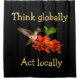 This shower curtain urges us to think globally and act locally. It features an image of a lovely hummingbird on a zinnia flower. You can easily change or remove the text. Our planet faces so many challenges. We must try to protect it for the future of our children.
