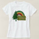 Cool vintage retro style features a cool rainbow reaching across the sky to a big tall pine or evergreen tree. Old sixties or seventies style font lettering with vintage washed distressed look. Choose from many other styles.