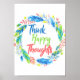 Think happy thoughts motivational quote wall art. Colourful spring wreath with flowers and feathers.