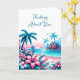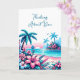 Pixal art that looks like needlepoint that depicts a picture of a blue ocean, palm trees and pink tropical flowers. Thinking about you card for a friend of family member.