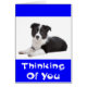 This cute Border Collie is ready to help you let friends and family know how special they are. This charming Thinking of You greeting card features a portrait of a black and white Border Collie puppy dog resting against a crisp white background with a vibrant blue border.