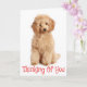 This cute canine card features an image of an apricot Poodle puppy dog with "Thinking of you" printed in a fun red font highlighted against a creamy white background.