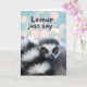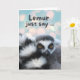 Cute Thinking of You, paper greeting card with a photo of a ring tailed lemur wrapped up in its tail. Wildlife themed greeting card. Lemur just say ... or Let me just say... pun written on the cover. Customise the interior message as desired. Art, image, and verse copyright © Shoaff Ballanger Studios, 2024.