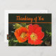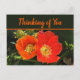 Cactus flowers are in full bloom on this southwest "thinking of you" postcard. The nature photo captures large bright red orange flowers along with the green cactus pads and large flower buds. "Thinking of You" appears in bright orange font against a dark green background at the top of this thank you note. The back of the postcard has been left blank for your personalised words or photos.