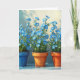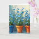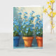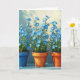 Three pots with vibrant blue forget-me-not flowers sit on a rustic windowsill, creating a serene and fresh atmosphere.