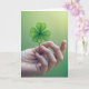 A hand delicately holds a four-leaf clover against a soft, blurred green background for thinking of you.