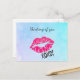 A postcard with a pair of sexy lips wearing hot pink lipstick with xoxo! written beside them, creating a lipstick impression. Text says thinking of you. Set on a turquoise blue watercolor background.