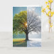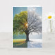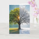 A striking depiction captures an oak tree showcasing two contrasting seasons, winter and summer.