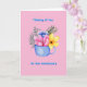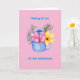 Watercolor arrangement of flowers set in a blue coffee mug set in a pink background. Inside of card reads "Let the adventure continue"!