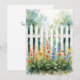 A white picket fence with flowers adorn this card. Text on the back can be changed. Image is AI-generated by IveyCottage.