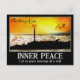 An image of a person sitting at the end of some rocks  under a beautiful sunset with seagulls flying past a full moon. Sayings printed on the postcard " INNER PEACE", I sit in peace knowing all is well.