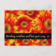 Bright and bold springtime floral design with glowing yellow and orange gerbera daisies. This vibrant colourful image contains bright mango yellows, intense orange and vivid fiery reds that really pop. Message reads, sending sunshine and love your way.