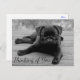 Aww...Who can resist the the sweet face of a Pug pup? This charming Thinking of You post card features a black and white portrait of a pug puppy dog resting on a wood porch.