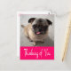 Aww...Who can resist the the sweet face of a Pug pup? This charming Thinking of You post card features a portrait of a tan pug puppy dog sticking her tongue out in greeting. A Thinking of you message is highlighted against a vibrant hot pink magenta border.