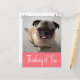 Aww...Who can resist the the sweet face of a Pug pup? This charming Thinking of You post card features a portrait of a tan pug puppy dog sticking her tongue out in greeting. A Thinking of you message is highlighted against a pink textured border.