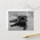 Aww...Who can resist the the cute face of a Pug puppy dog? This Postcard features a black and white portrait photo of a black pug puppy resting on a porch.