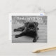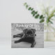 Aww...Who can resist the the cute face of a Pug puppy dog? This Postcard features a black and white portrait photo of a black pug puppyresting on a porch.