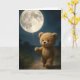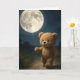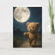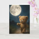 A teddy bear walks along a path in a dark, wooded landscape, holding a string tied to a glowing, balloon-like full moon.