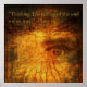 Composited image with Leonardo Da Vinci's Vitruvian Man and a staring eye with Plato's words "Thinking. The talking of the soul within itself"