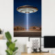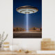 A flying saucer-shaped spacecraft hovering over a fenced military facility that is supposed to be zone 51 or area 51. A powerful ray of light descends from the center of the UFO towards the entrance of a restricted area, illuminating the starry night and the surrounding desert space.
