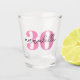 Personalised 30th birthday shot glass with pink age text and modern script name. Colours and fonts can be changed if required.