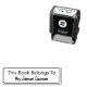This self-inking stamp is a text template that you can edit to show a custom message. Currently, the top line of the display text says This Book Belongs To. The bottom line is for the teacher's name (Shown: Mrs. Johnson's Classroom). A border appears around the text.
