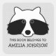 This book belongs to cute racoon bookplate label stickers. Forest animal name tag stickers. Personalised school supplies for little boys and girls. Cute illustration with personalised kids name. Children's vector design in primary colours. Available in square and round shape. Custom back to school supplies for child, parents, teacher etc. Grammar / elementary school accessories. Grey Polka dots pattern background.