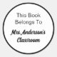 You can edit the text on this black and white sticker to show your custom message. (Shown: This Book Belongs To Mrs. Anderson's Classroom) The teacher's name will be in bold script.