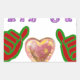 The colour palette is vibrant and lively, utilising contrasting hues to enhance the playful nature of the design. The hands are primarily red with green outlines, while the heart showcases a mix of pinks, yellows, and white. The text is rendered in purples and reds, set against a clean white background that makes the elements pop. The use of multiple colours and textures within the heart adds depth and visual interest.